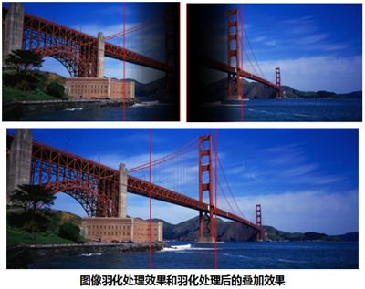 融合帶的羽化處理是將兩個(gè)投影機(jī)投射畫面的重疊部分,分別做圖像強(qiáng)度的連續(xù)而非線性變化,讓兩個(gè)投影機(jī)投射的畫面重疊部分圖像強(qiáng)度與融合帶兩側(cè)沒有經(jīng)過重疊部分的圖像強(qiáng)度相一致, 產(chǎn)生色彩一致的融合畫面。